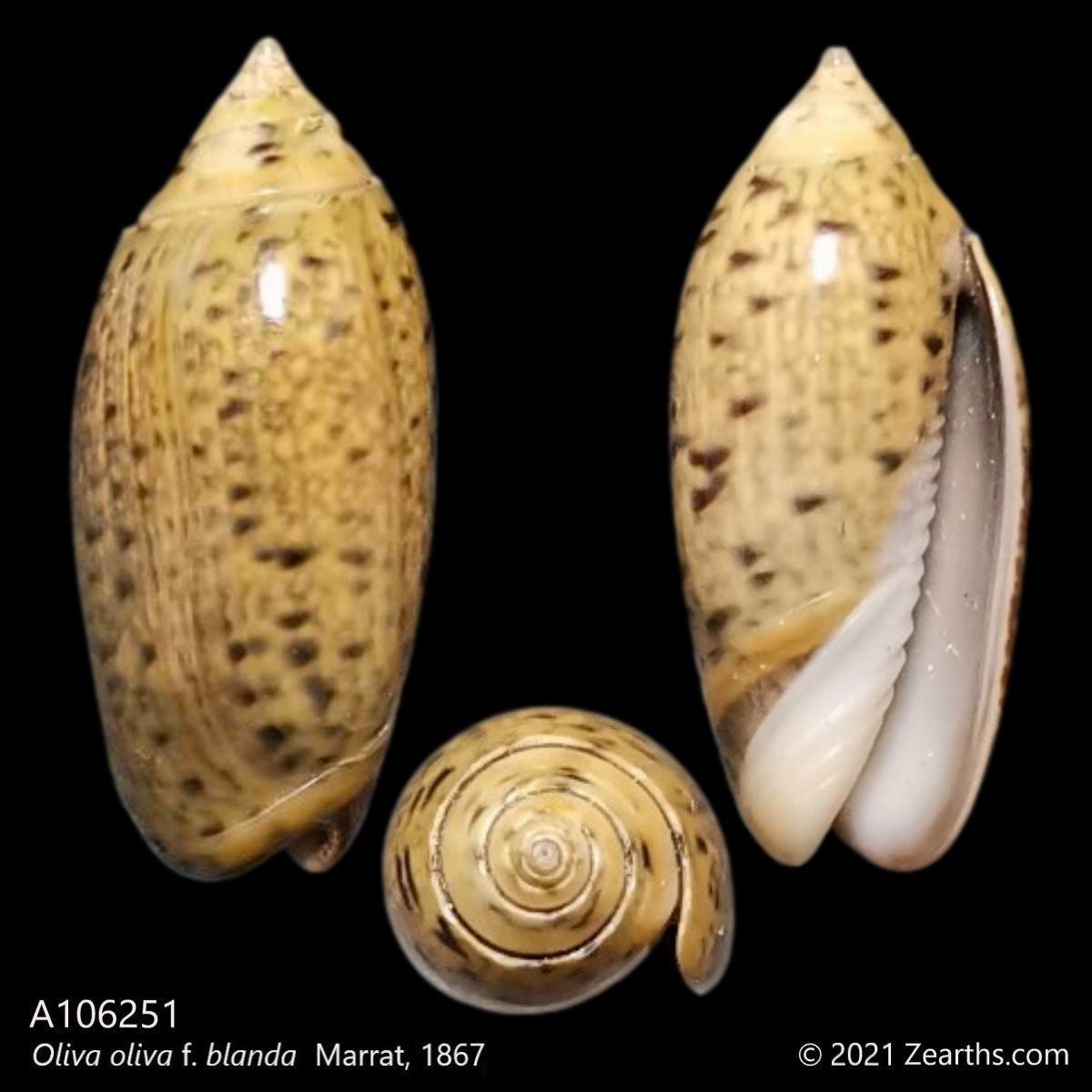 Oliva oliva, common name the “pearl olive” or “common olive”, is a species of sea snail, a marine gastropod mollusk in the family Olividae, the olives.