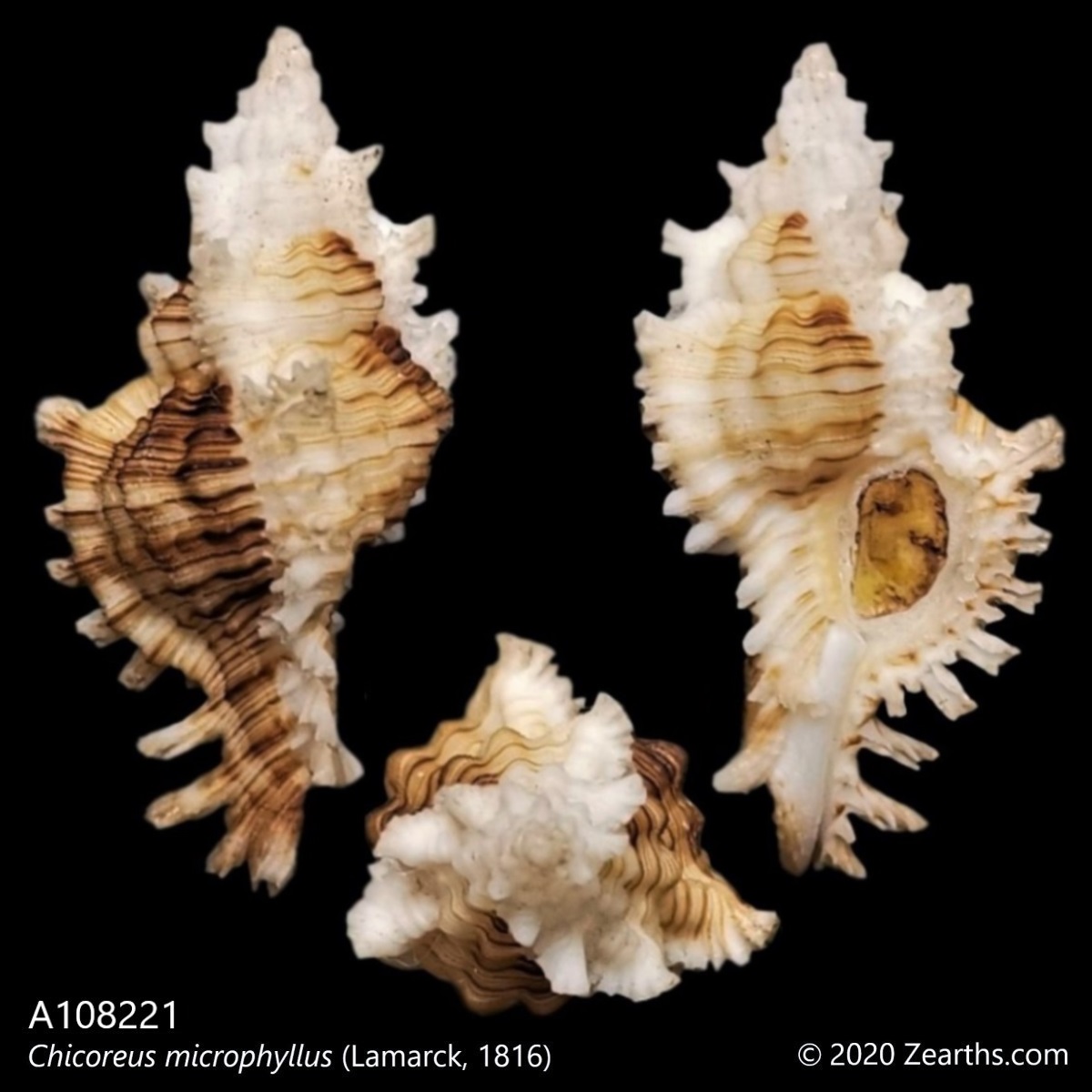 Chicoreus microphyllus, common name the “curly murex”, is a species of sea snail, a marine gastropod mollusk in the family Muricidae, the murex snails or rock snails.
