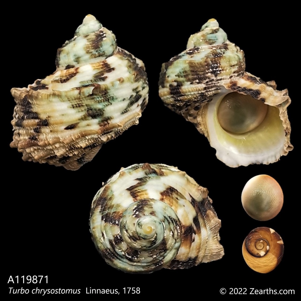 Turbo chrysostomus, common name the “gold-mouth turban”, is a species of sea snail, a marine gastropod mollusk, in the family Turbinidae, the turban snails.