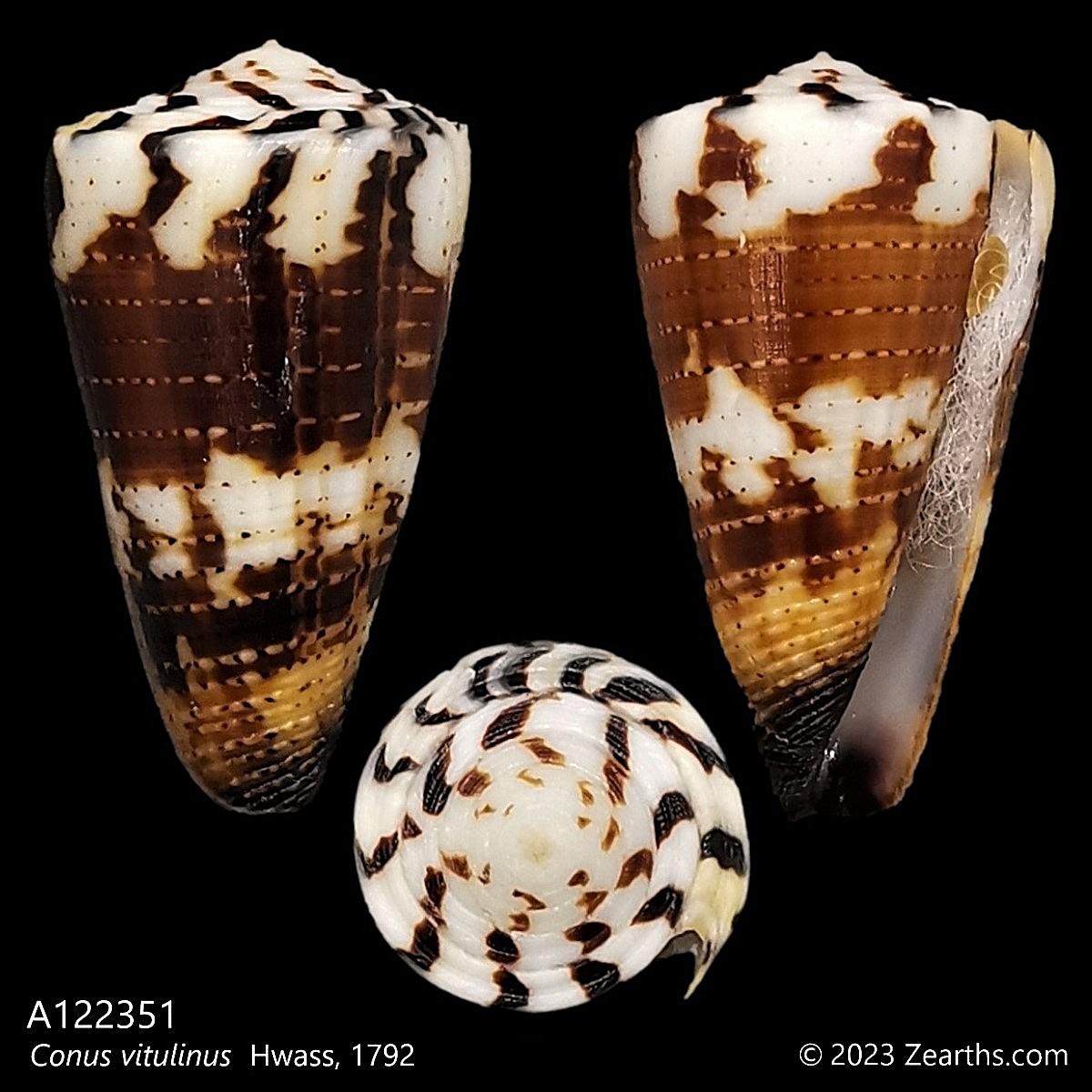 Conus vitulinus, common name the “calf cone”, is a species of sea snail, a marine gastropod mollusk in the family Conidae, the cone snails and their allies.