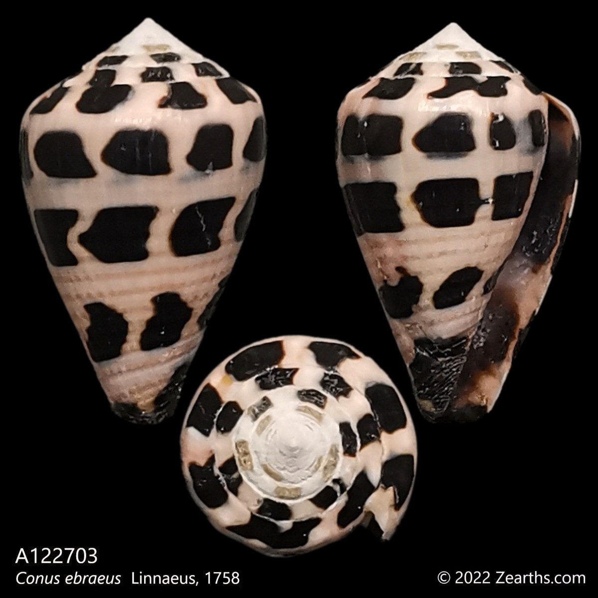 Conus ebraeus, common name the “black-and-white cone”, is a species of sea snail, a marine gastropod mollusk in the family Conidae, the cones.