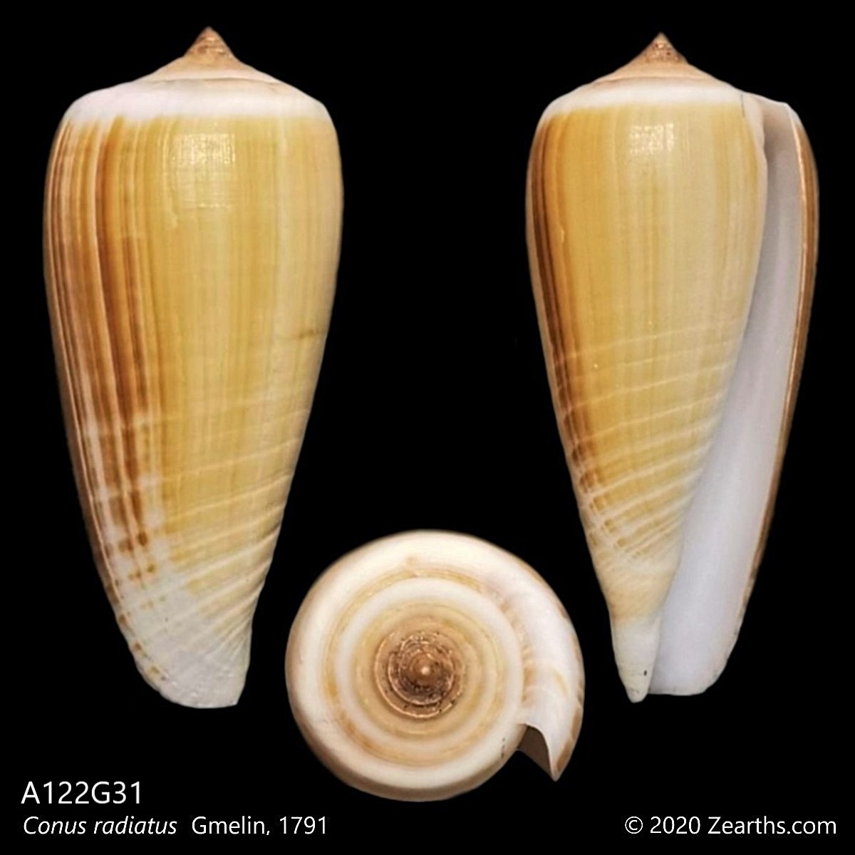 Conus radiatus, common name the “rayed cone”, is a species of sea snail, a marine gastropod mollusk in the family Conidae, the cone snails and their allies.