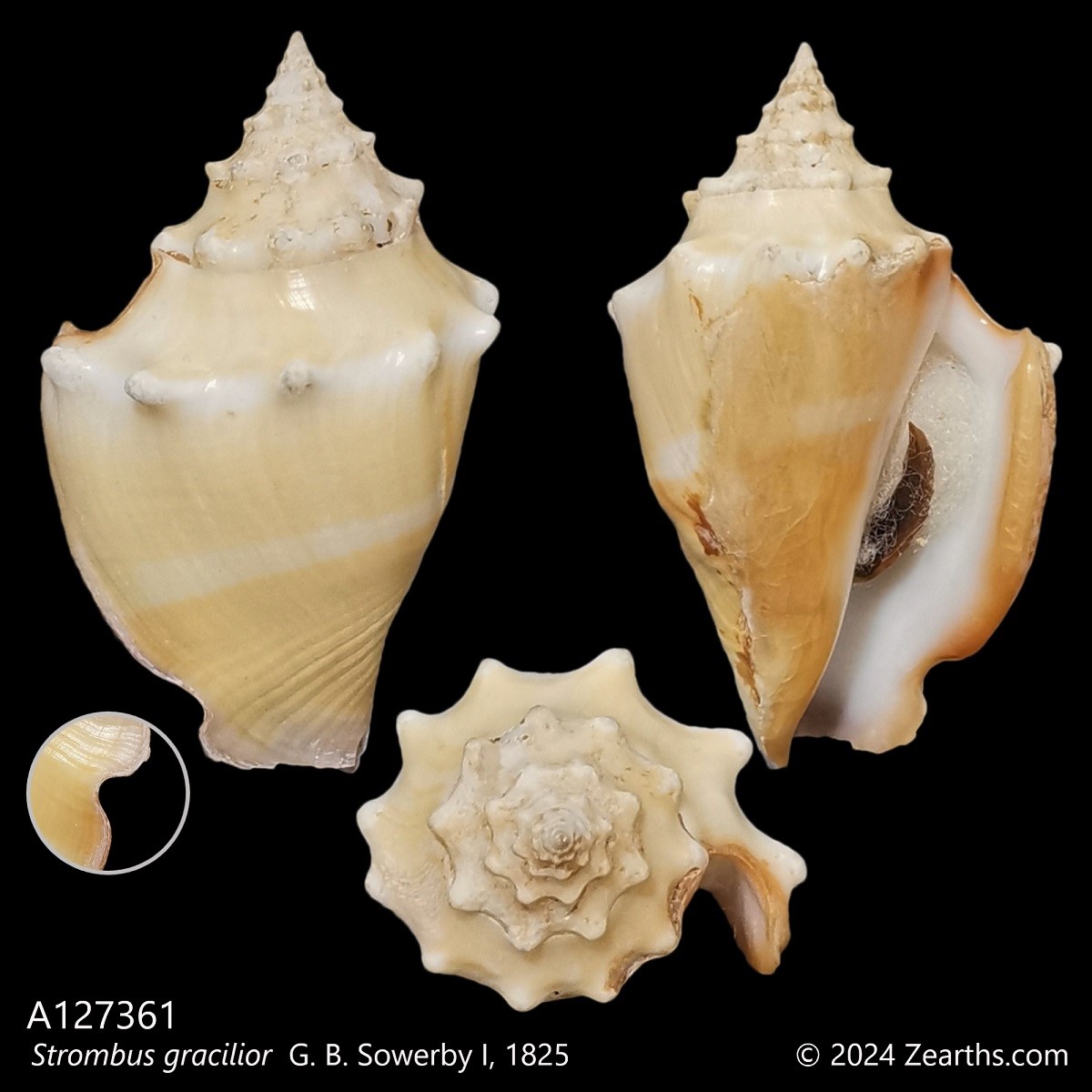 Strombus gracilior, common names the “Eastern Pacific fighting conch”, or the “Panama fighting conch”, is a species of medium to large sea snail, a marine gastropod mollusk in the family Strombidae, the true conchs.