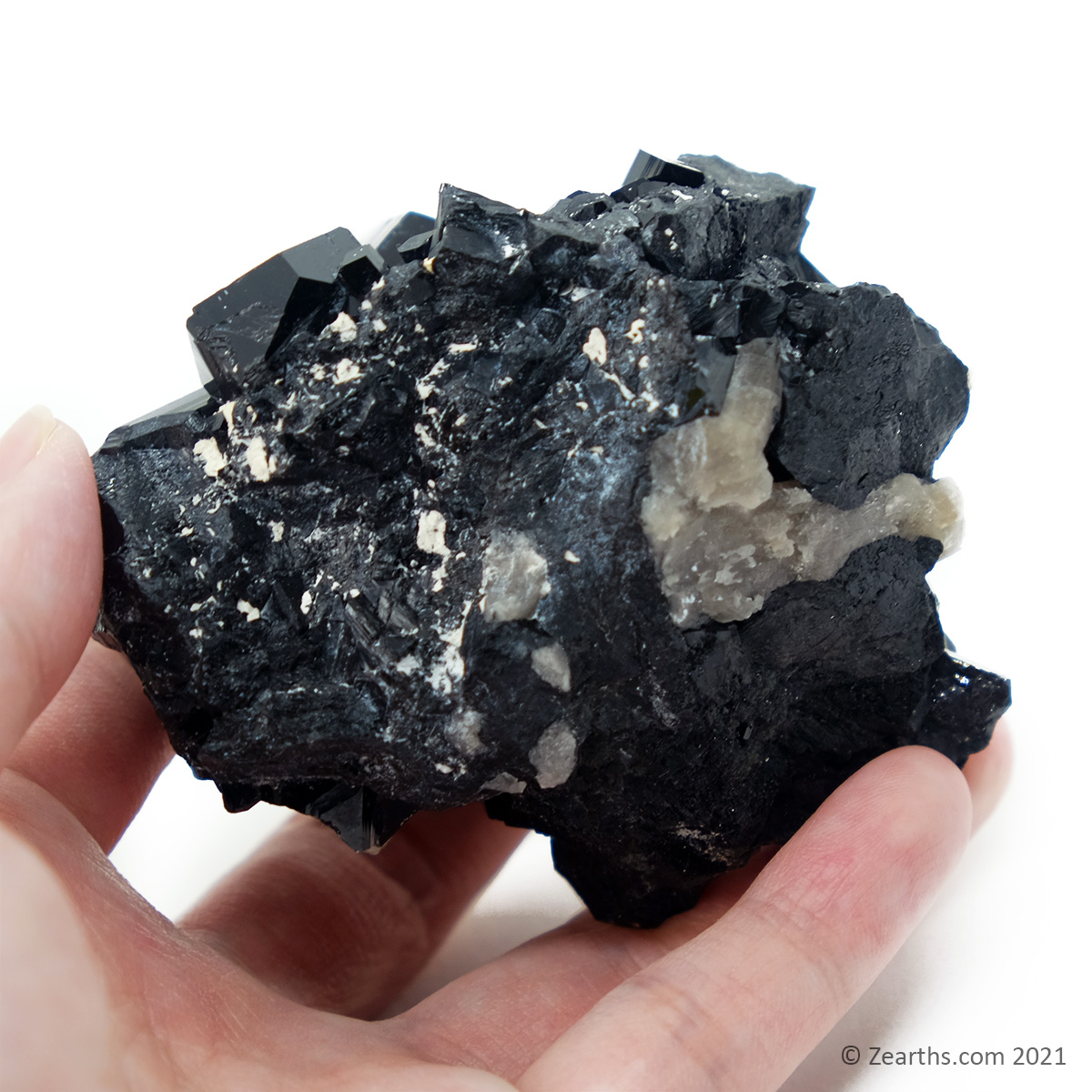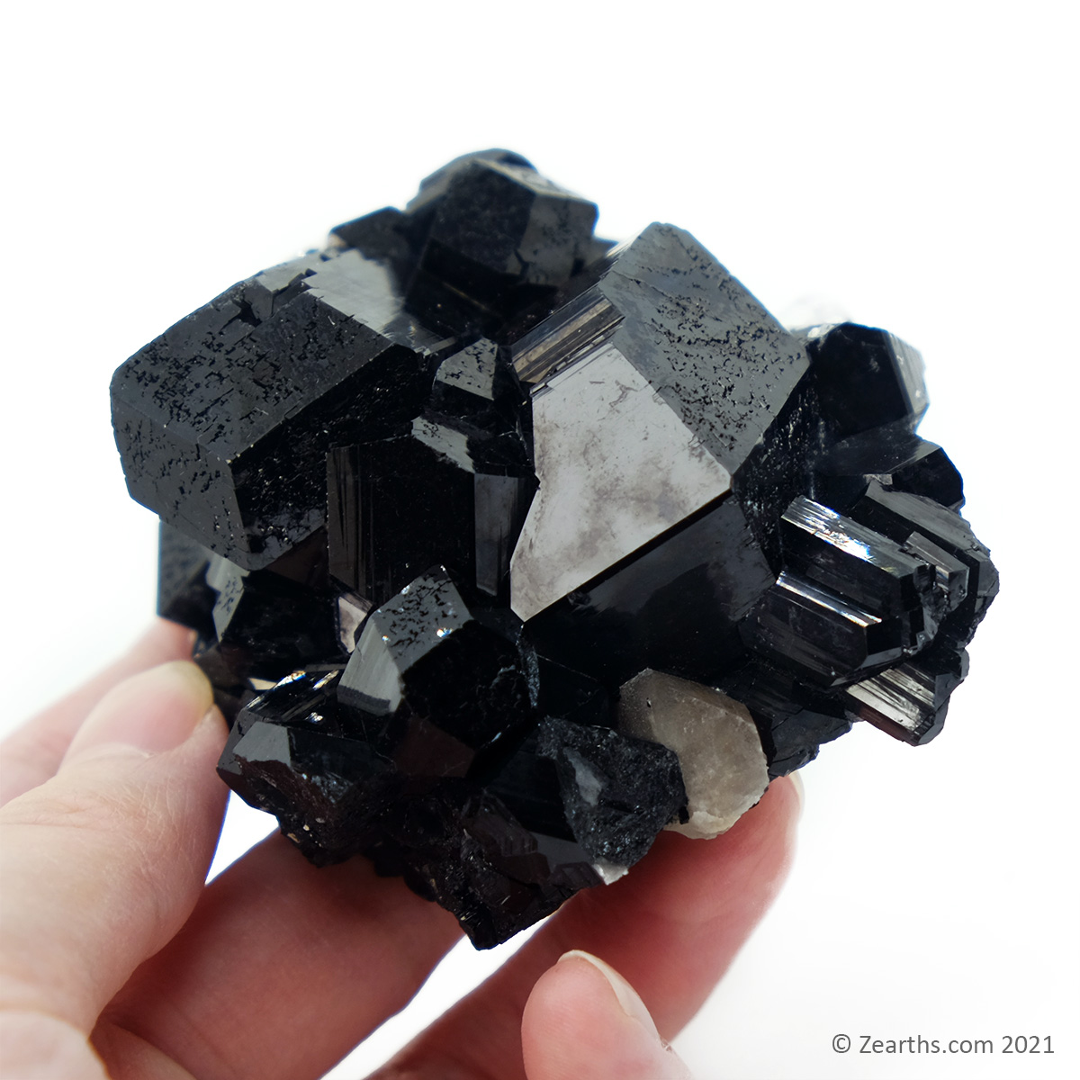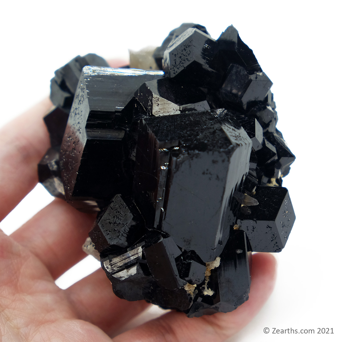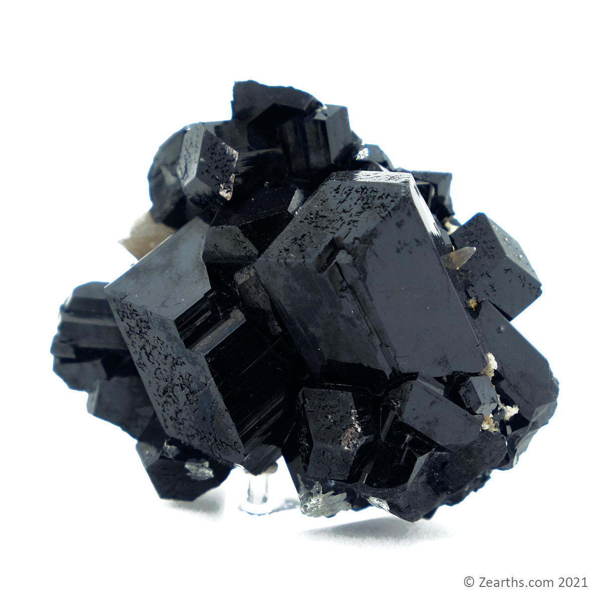A great cluster of huge, lustrous, well-terminated black tourmaline crystals with a bit of smoky quartz in pristine condition.
