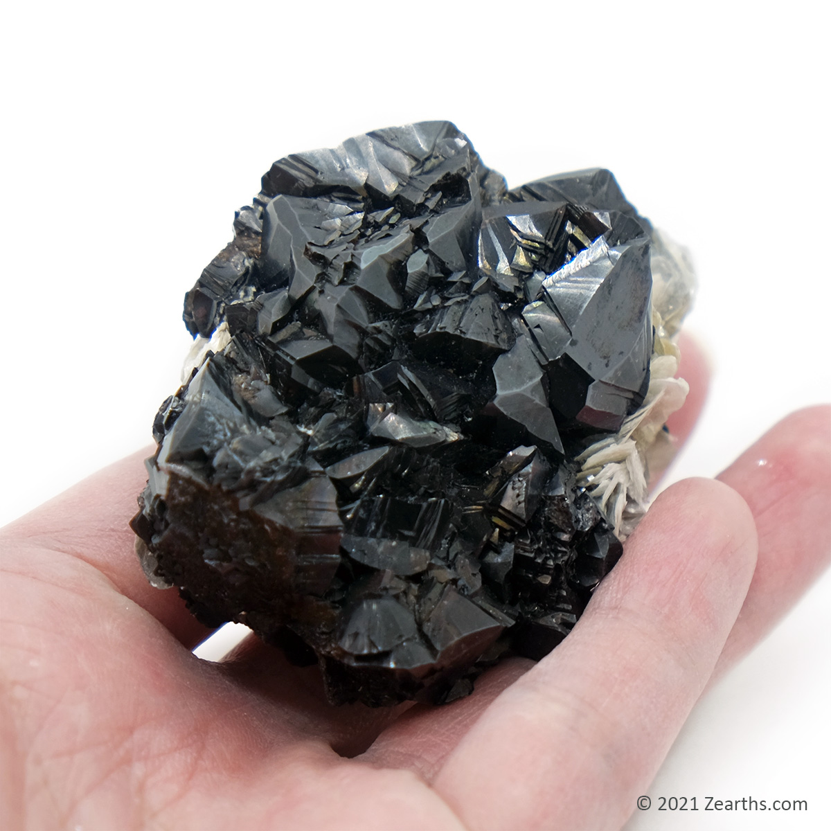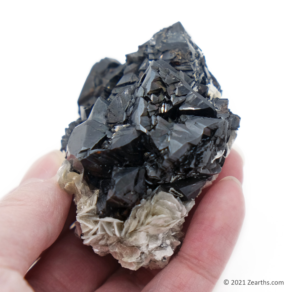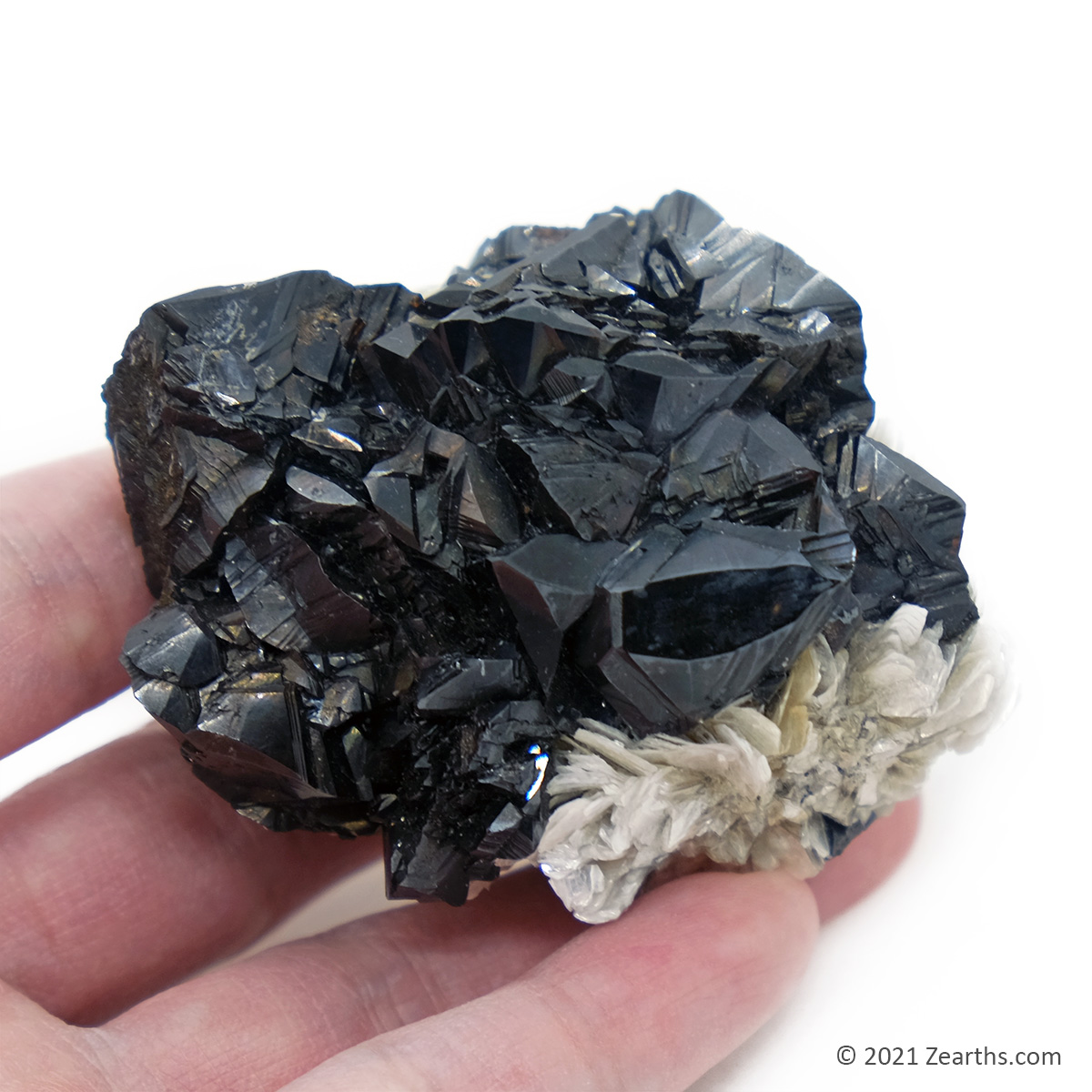 A nice cluster of shiny black cassiterite crystals is sitting on top of a matrix of muscovite. A beautiful specimen from the classic locality.