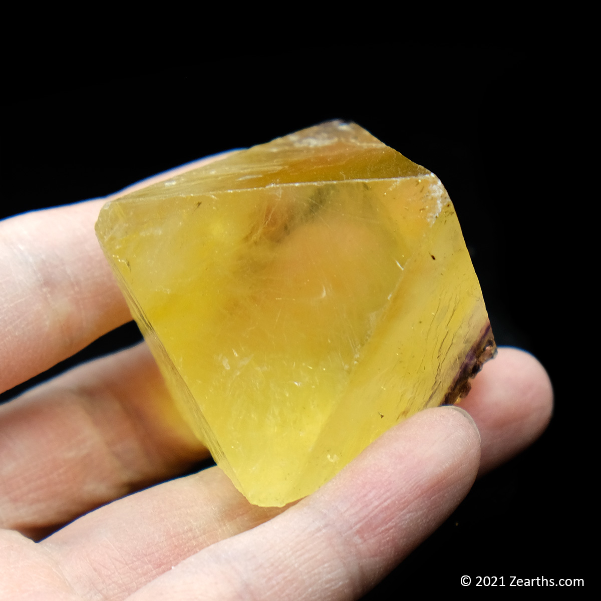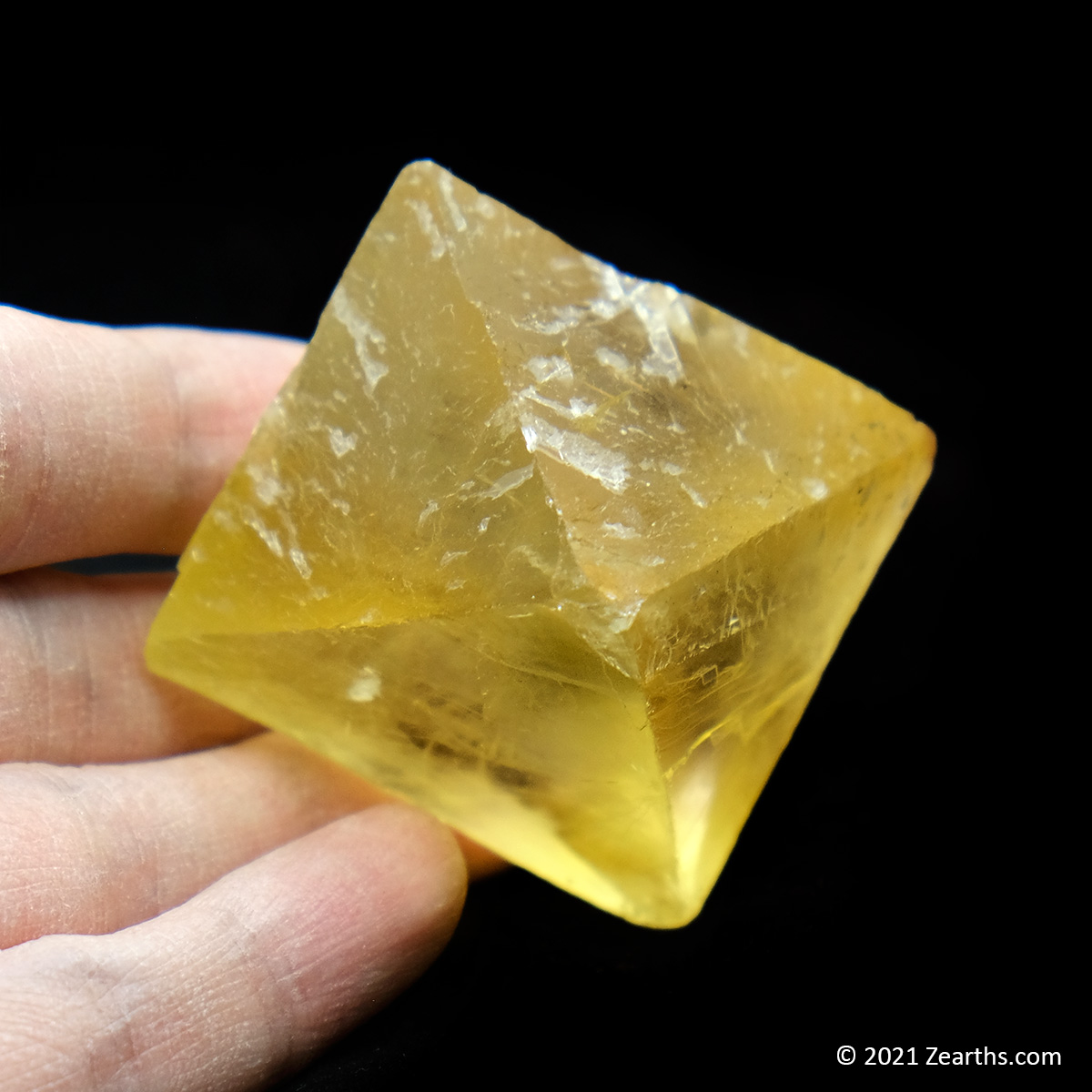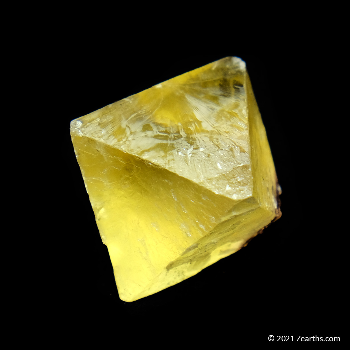This is a very fine example of the gem variety of yellow fluorite “diamonds” with chalcopyrite inclusions from the last century. The piece has been cleaved from a larger piece of fluorite by a miner into the octahedron shape. It fluoresces pink under UV exposure. These fluorite “diamonds” became very hard to get today since the mines in the southern Illinois have been closed in the mid-1990s. Miners back then used to cleave these “diamonds” during their lunch breaks.